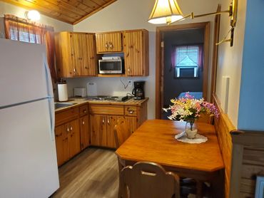 Small Kitchenette equipped with all dishes, pots and pans. Microwave. Coffee Pot. Stove. Refrigerator.